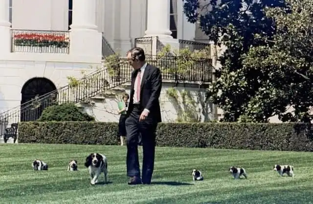 Президент Джордж Буш выгуливает на лужайке Белого дома свою собаку спрингер-спаниель Милли с щенками. 20 апреля 1989 г.