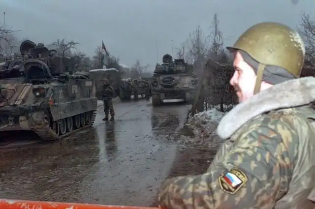 Российский военный рядом с техникой американской армии, Босния, 1995 год.