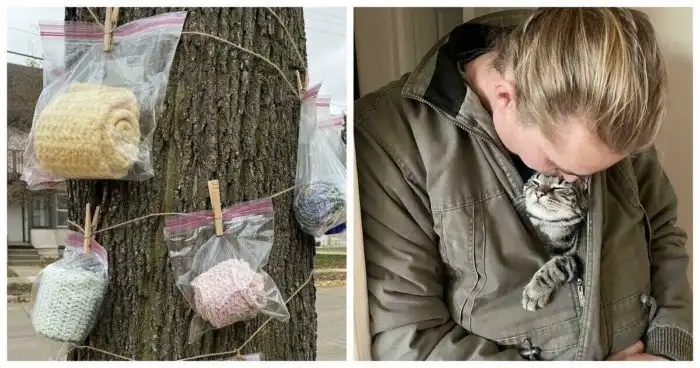 25. "Кто-то в моем районе связал несколько шапок и шарфов и оставил их на дереве для желающих. Просит только не забирать прищепки"