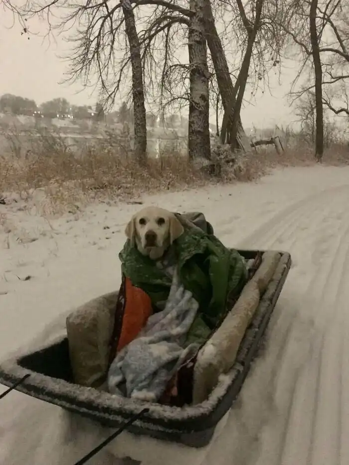 8. Пёсик старенький, ему уже 13 лет. Поэтому на долгие прогулки он отправляется в собственных санях