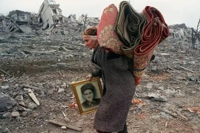 Пожилая жительница Грозного уносит самое дорогое, 1995 г., Россия