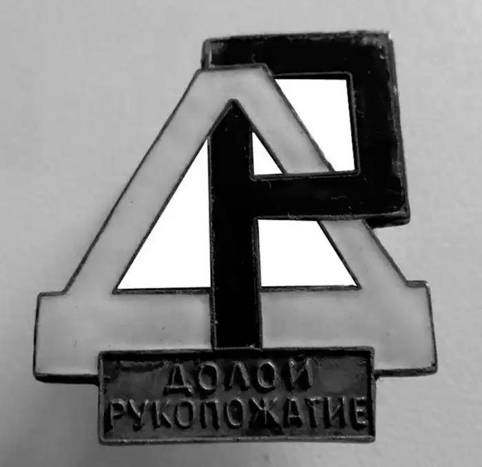 28. Значок «Долой рукопожатие» распространялся в рамках компании по борьбе с инфекционными заболеваниям. СССР. 1920-е