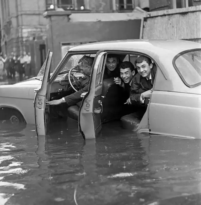 9. 8 июня 1966 года на Москву обрушился сильнейший дождь. Автомобиль Волга ГАЗ-21 на одной из затопленных улиц. Лев Поликашин