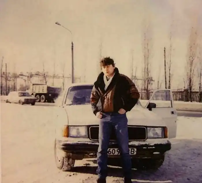 10. Юрий Хой (Клинских) со своим автомобилем ГАЗ-31029 «Волга»; Воронеж, 1995 год