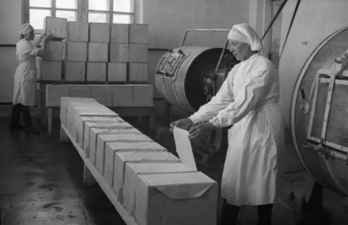 34. Упаковка Вологодского масла на Абакановском маслозаводе Череповецкого района. 1950 год.