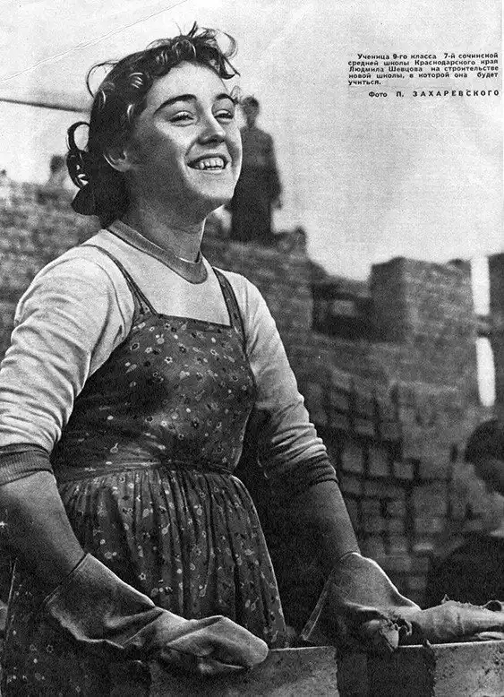 35. Ученица 9-го класса сочинской 7-й средней школы Людмила Шевцова на строительстве новой школы, в которой будет учиться.