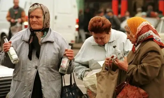 Российские пенсионерки продают дешевую водку на одной из центральных улиц Москвы, сентябрь 1998 года.