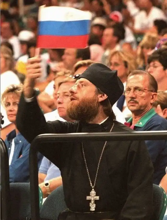 Православный священник болеет за женскую сборную России по баскетболу во время летних Олимпийских игр 1996 г. в Атланте (США), 31 июля 1996 г