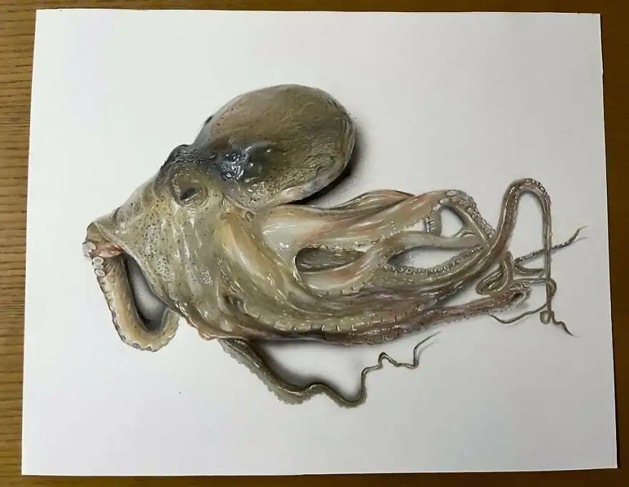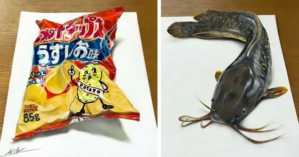 Японская художница-самоучка Ария создает гиперреалистичные 3D-рисунки с эффектом оптической иллюзии — герои и объекты ее работ словно вылезают из бумаги! Сперва Ария делает набросок того, что она хочет нарисовать, а затем закрашивает его цветными карандашами и вносит последние штрихи, чтобы ее двухмерные работы казались трехмерными.
