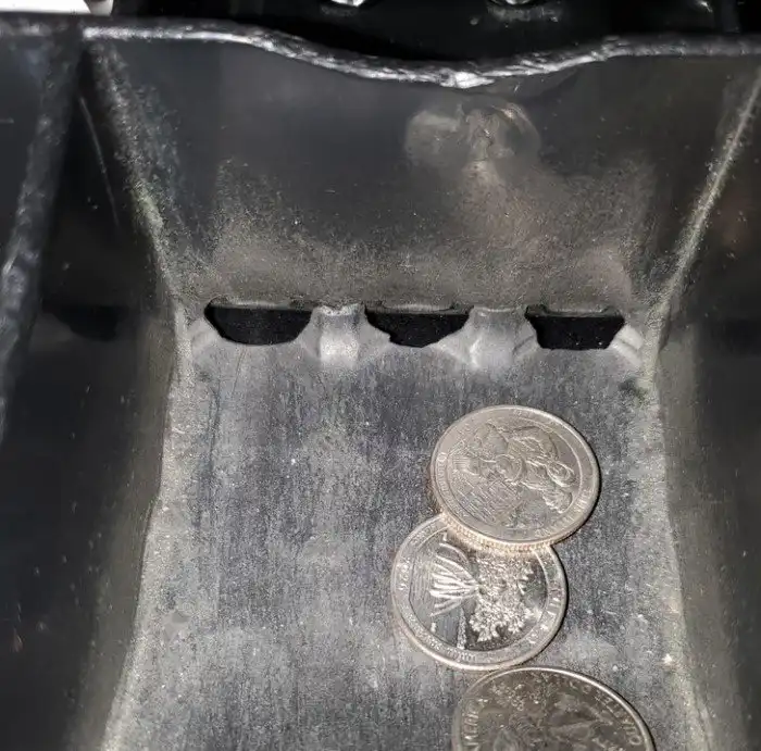 13. «Это касса в магазине, где я работаю. Посмотрите на дыры, которые образовались в лотке со временем из-за того, что кассиры выгребают оттуда сдачу»