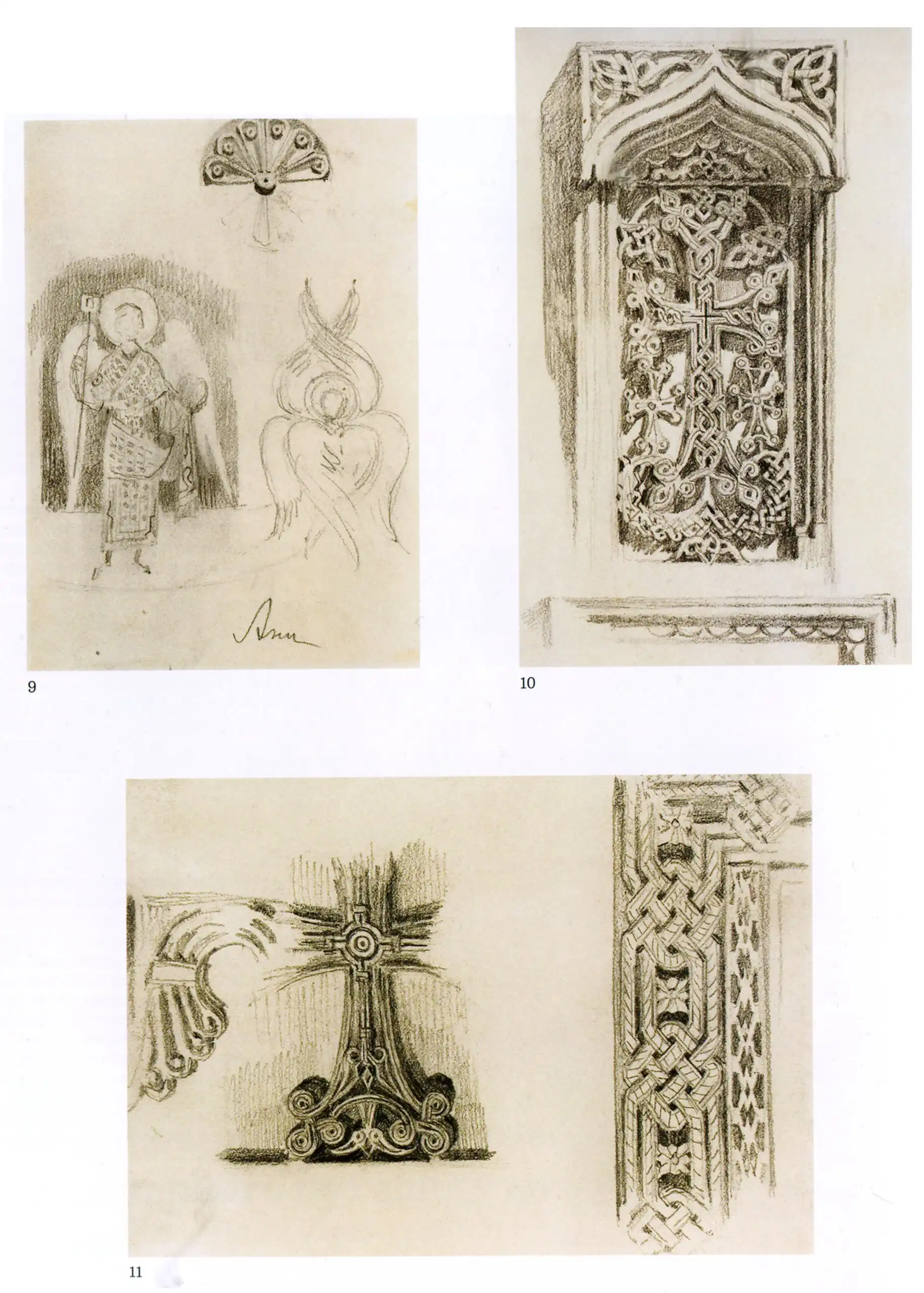 12. Крест в орнаментальном обрамлении. Розетка. Часть сдвоенной колонны с капителью. Детали резьбы по камню