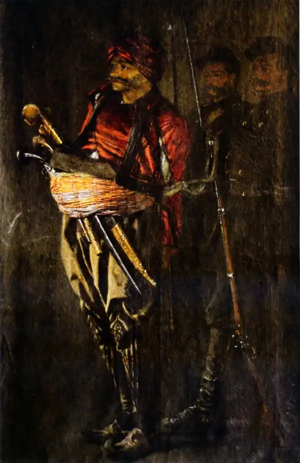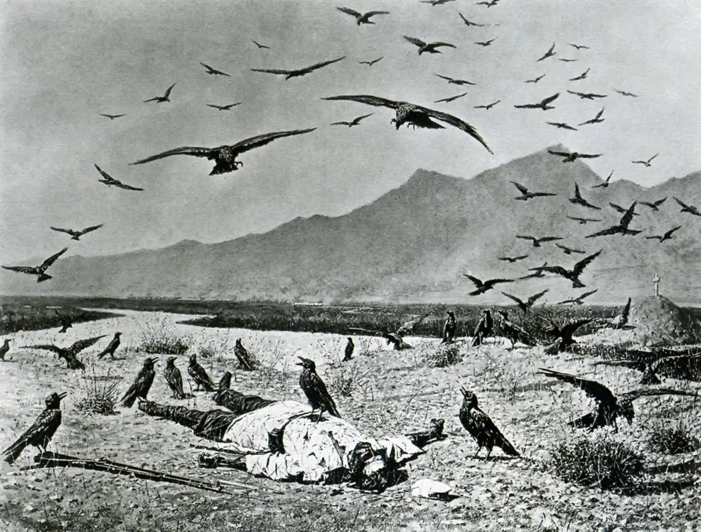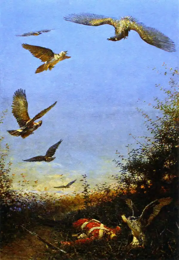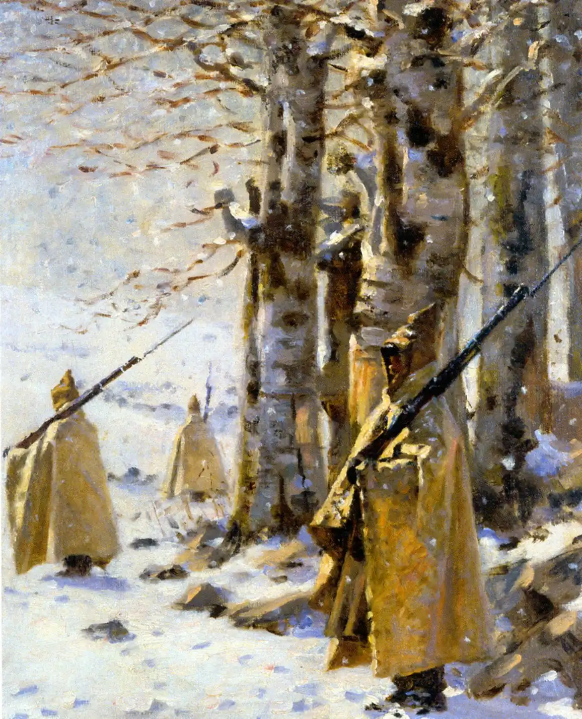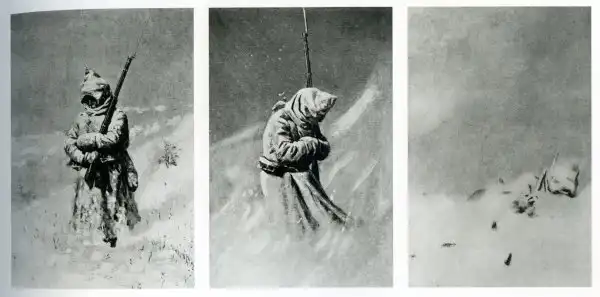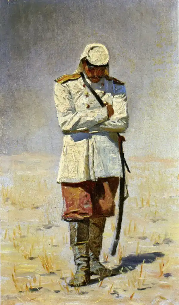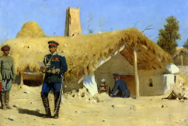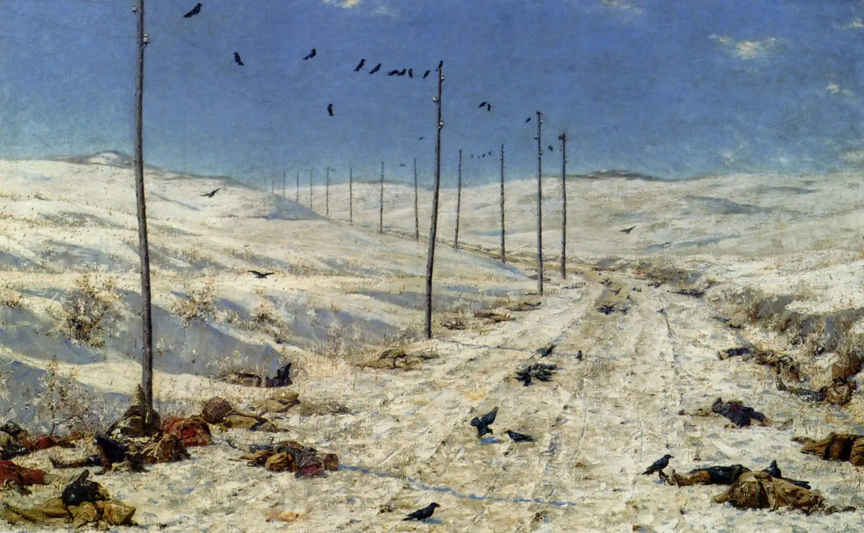 После взятия Плевны художник совершил в колонне М.Д. Скобелева труднейший зимний переход через Балканы и участвовал в решающем бою за Шипку у деревни Шейново. В конце войны Верещагин гордо отказался от награждения “золотой шпагой”. Живые впечатления о войне, натурные наблюдения за происходящим он запечатлел на многочисленных этюдах и эскизах, так как не расставался в походах с альбомом и красками. В 1878-1879-м в парижской мастерской было написано около тридцати полотен Балканской серии, среди которых нет ни одной “мирной” жанровой сцены.