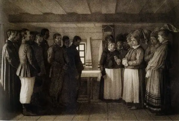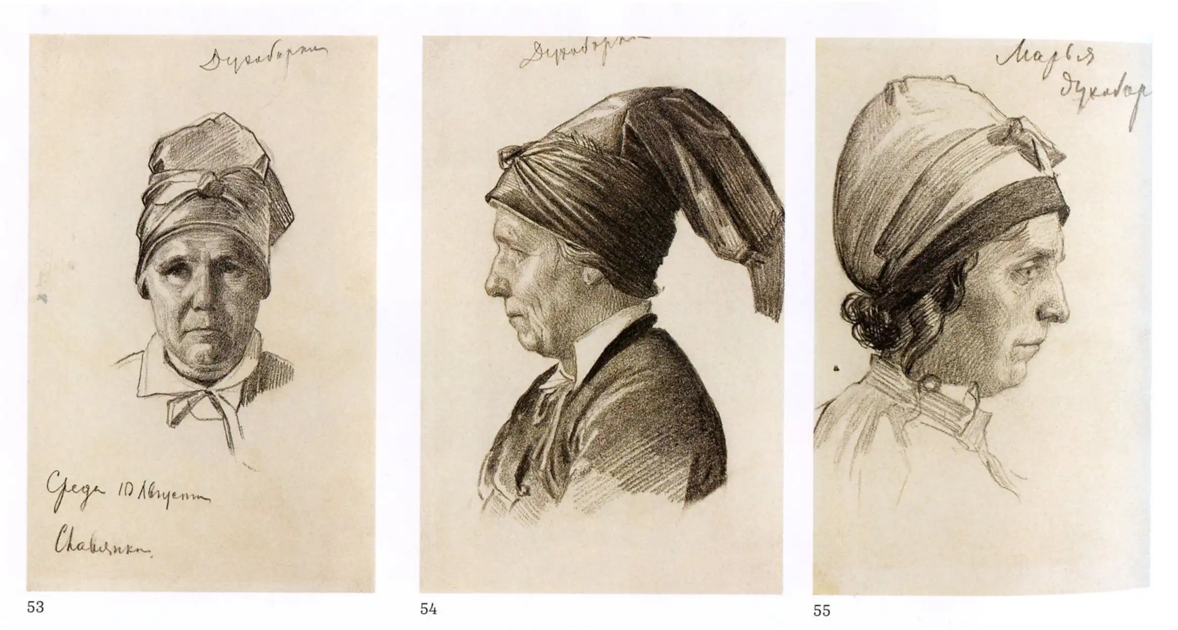 53. В Славянке: духоборка. Духоборы (духоборцы) – религиозная группа, отвергающая внешнюю обрядность Русской Православной церкви. Духоборство распространилось по многим губерниям и подверглось преследованиям со стороны православных и светских властей. Село Славянка основано в 1844 духоборами, переселёнными царским указом с территории нынешней Запорожской области Украины. В 1898 жители Славянки присоединились почти к 8000 духоборов Закавказья и отбыли из порта Батум в Канаду (в провинцию Саскачеван), где на неосвоенных землях основали две колонии под названием Славянка (к 1911 обе колонии опустели, а их жители переселились в другие общины).