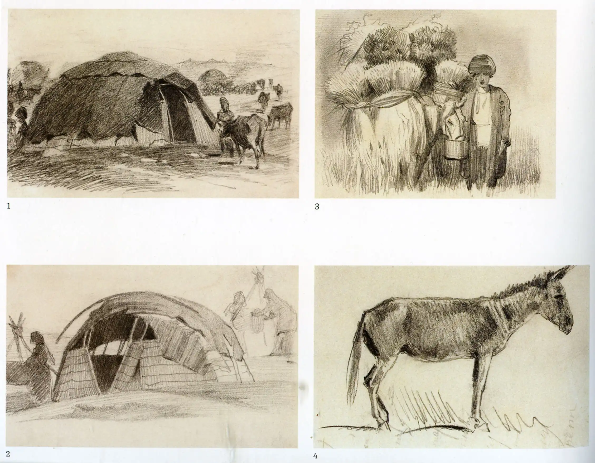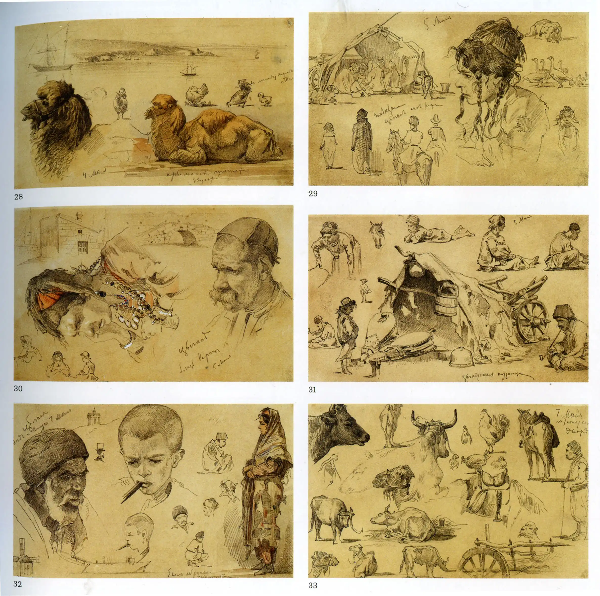 29. В цыганском таборе около Керчи: девочка-цыганка; цыганская семья в шатре; двое цыган на конях; мужчина, идущий с ребёнком; сидящая цыганка; лежащая собака; гуси