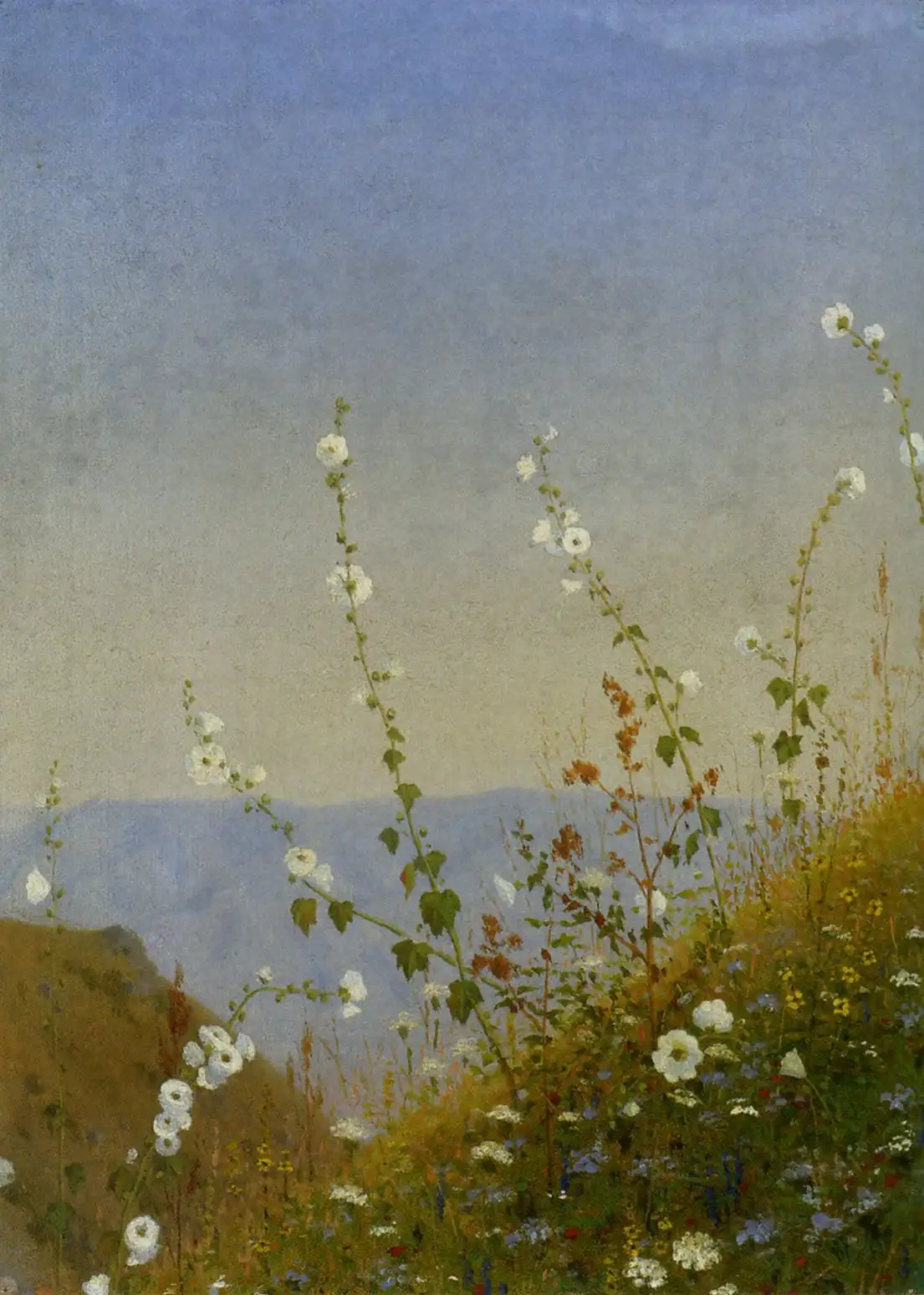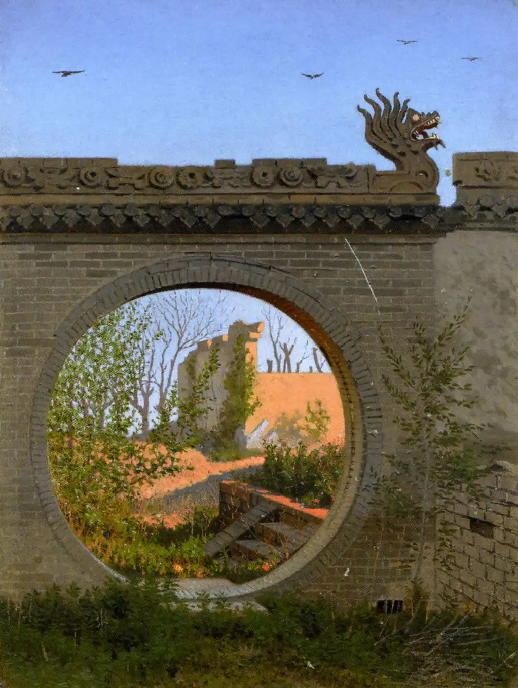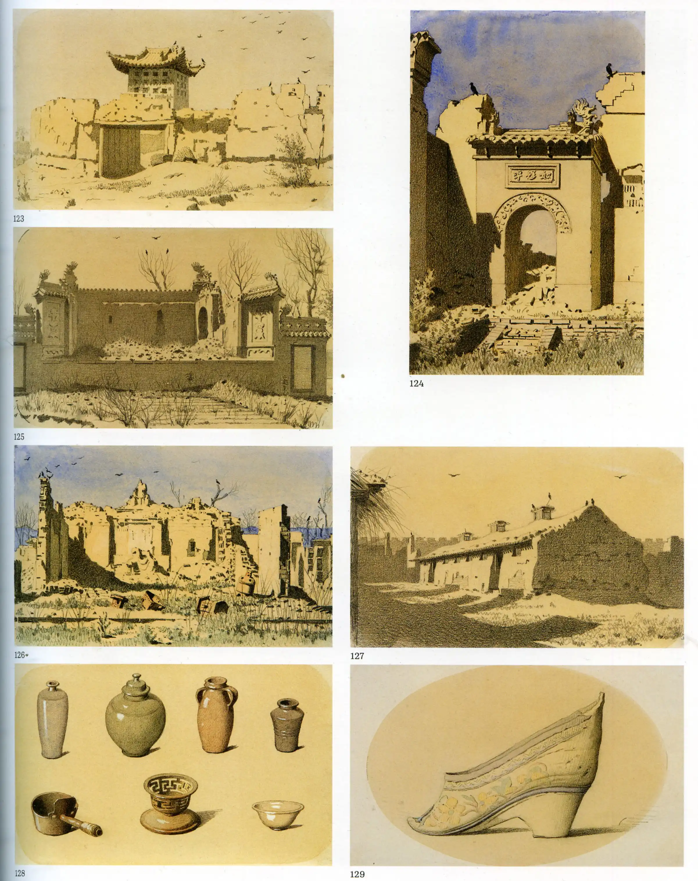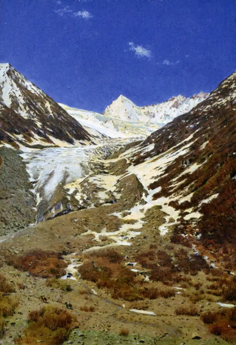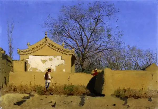В воспоминаниях о путешествии по горам Кашмира Верещагин писал о “роде жертвенных памятников, украшающих горные перевалы, обходимых путниками непременно с правой стороны, чтобы не возбудить гнева божества гор и дорог”. На дорогах Тибета и Бутана буддийские ступы, или по-тибетски чортены, встречаются повсюду. Вероятно, этюд написан в окрестностях одного из высокогорных монастырей, расположенных в долине реки Инд. Как следует из названия этюда, европейский путешественник XIX века не понимал священного значения буддийских ступ. Это культовые сооружения, места поклонения, символизирующее мироздание. Они происходят от добуддийских могильных курганов, их возводили для хранения священных реликвий, в качестве подношения Будде и напоминания о значительных событиях. Они служили путевыми знаками и оберегами для путешественников.