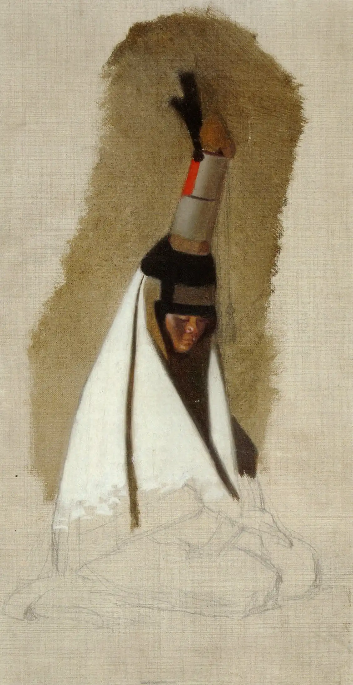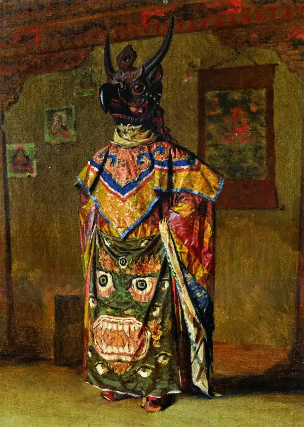 Очевидно, Верещагина больше всего заинтересовало, что участвовавшие в мистерии ламы делились на докшитов и шинаков. Первые танцевали в масках из папье-маше, полностью закрывающих лицо, и представляли образы докшитов – хранителей буддийской веры в их гневных воплощениях. Вторые исполняли образы лам-созерцателей, их украшали лишь костюмы и головные уборы, лица шанаков оставались открытыми. На этюде “Буддийский лама в костюме Главного Божества на празднике в монастыре Пемиончи. Сикким” изображён лама-созерцатель, а на этюде “Буддийский лама на празднике в монастыре Пемиончи. Сикким” – лама-докшит в маске мифической птицы Гаруды с тремя глазами, клювом, ушами и рогами. В буддизме эта птица изображалась с человеческим телом и птичьей головой, терзающей в клюве змею, которая символизировала сомнения в буддийской вере. Таким же образом – как гневное воплощение хранителя веры, терзающего за неверие, трактовалось и участие этого персонажа в мистерии Цам.