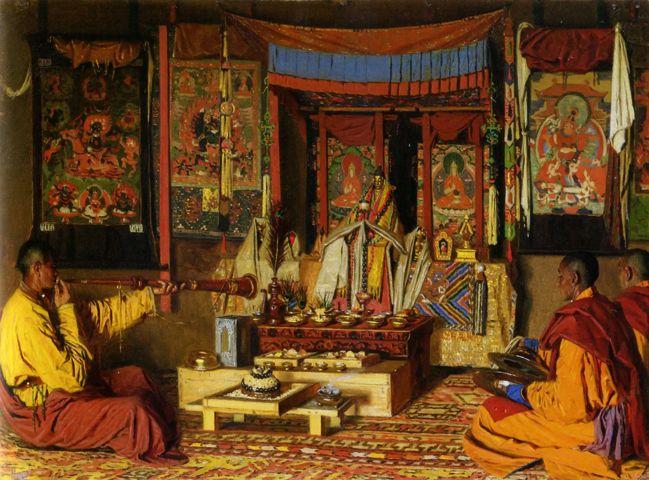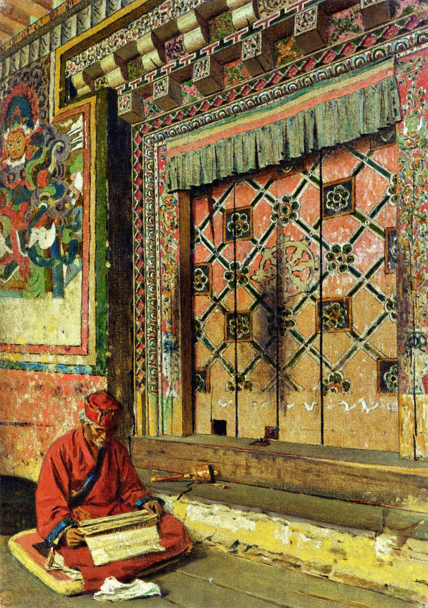 Художник рассказывал об “огромных молитвенных машинах” из тибетских храмов, которые почти постоянно вращаются “или самими ламами, или добровольцами из богомольцев с неизбежным, нараспев произносимым приговором: “Ом мани падми хум!”. Эти машины устраиваются иногда в колоссальных размерах при быстринах горных потоков или рукавов от них, причём вода вертит уже целые миллионы строчек молитв, и, конечно, быстро замаливаются всякие грехи, вольные и невольные”.