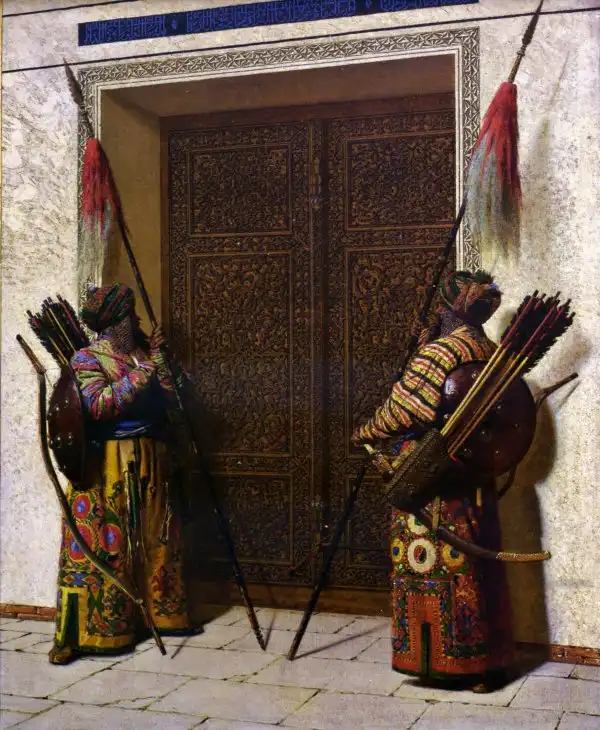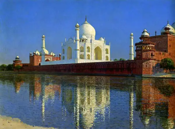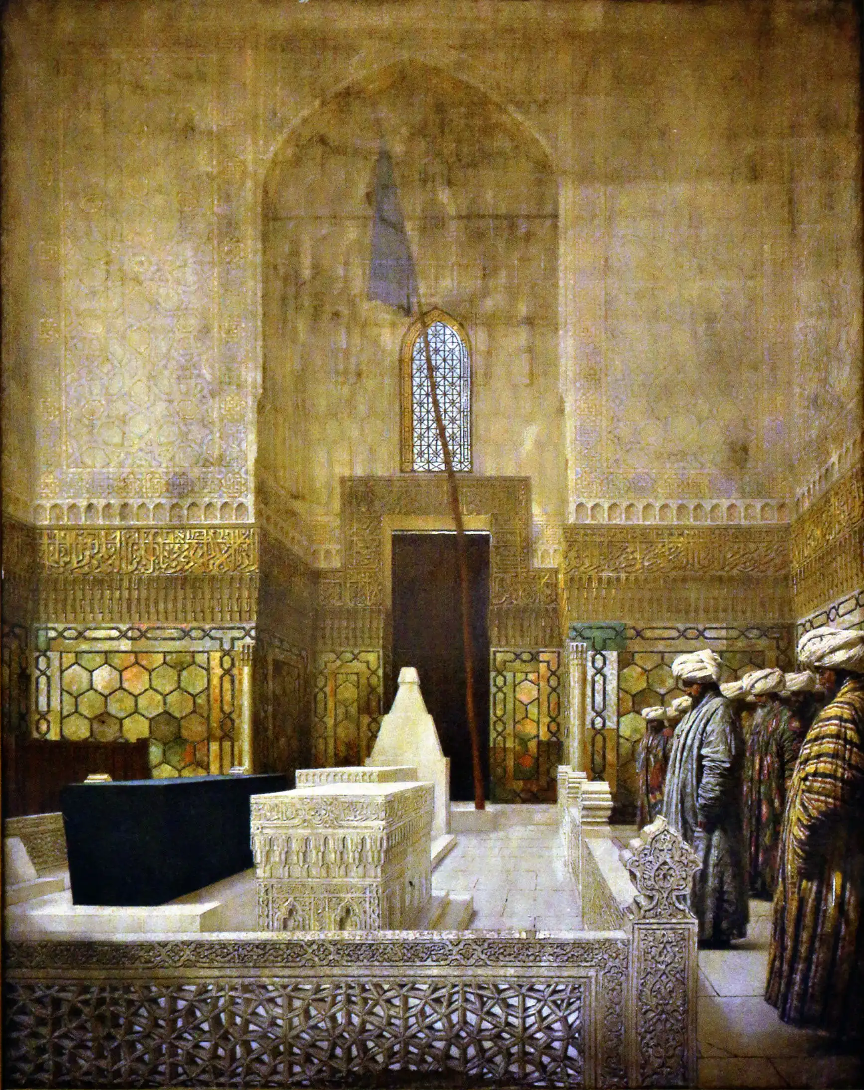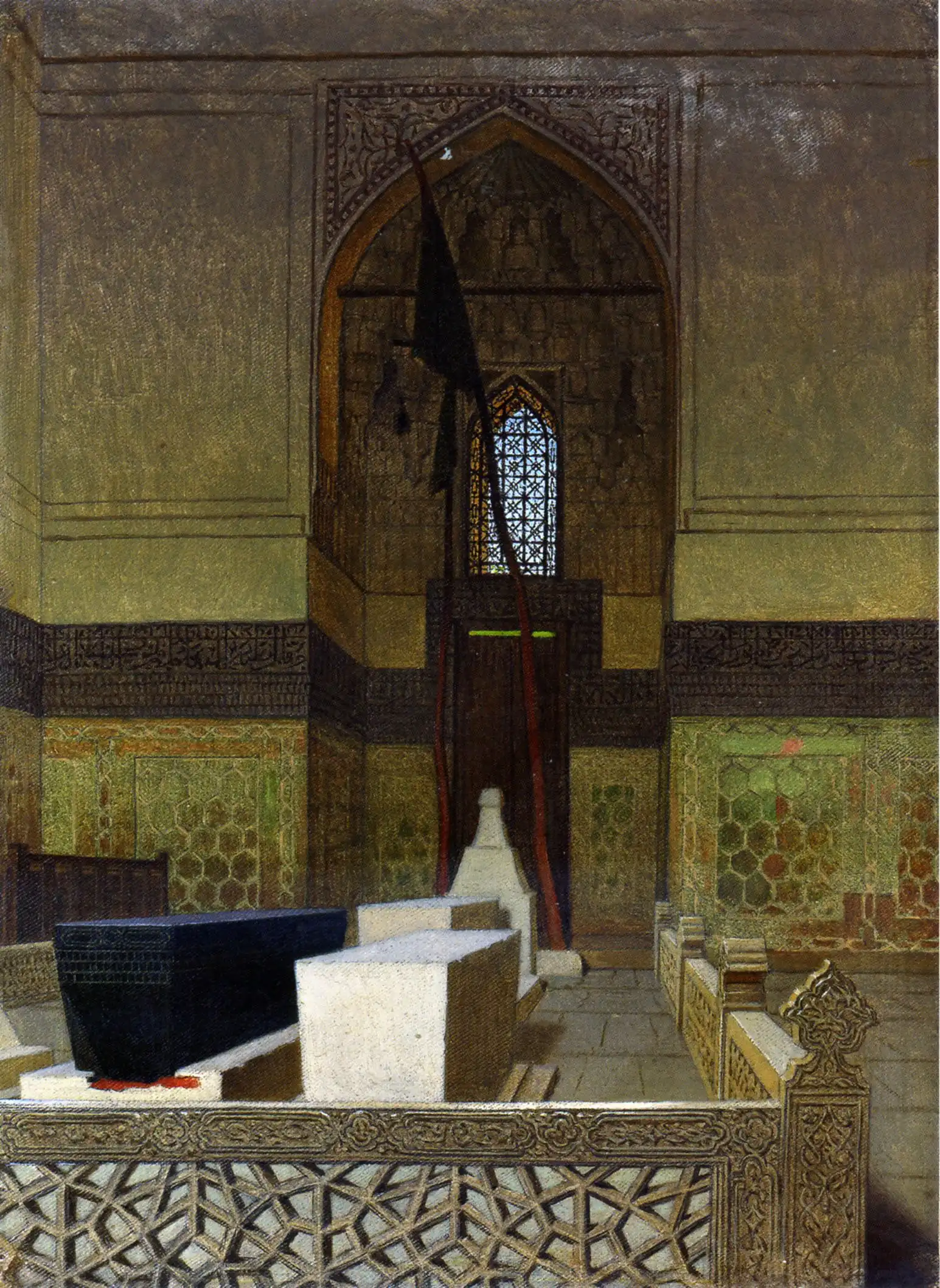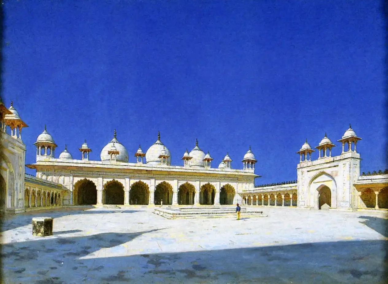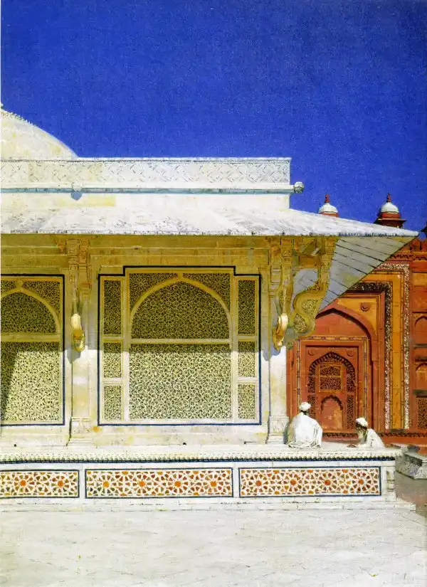 Подлинной жемчужиной форта, его духовной доминантой стала усыпальница святого суфия Салима Чишта, возведённая в 1580-1581. Внимание художника привлекли стены величественного беломраморного мавзолея с филигранными кружевами решёток, которые резко выделяются на фоне тёмно-красного здания соборной мечети. В полутени под крышей – консоли, вырезанные из цельных кусков мрамора в форме причудливо изогнувшейся змеи. На переднем плане – богато украшенный постамент кенотафа, инкрустированный цветным мрамором.