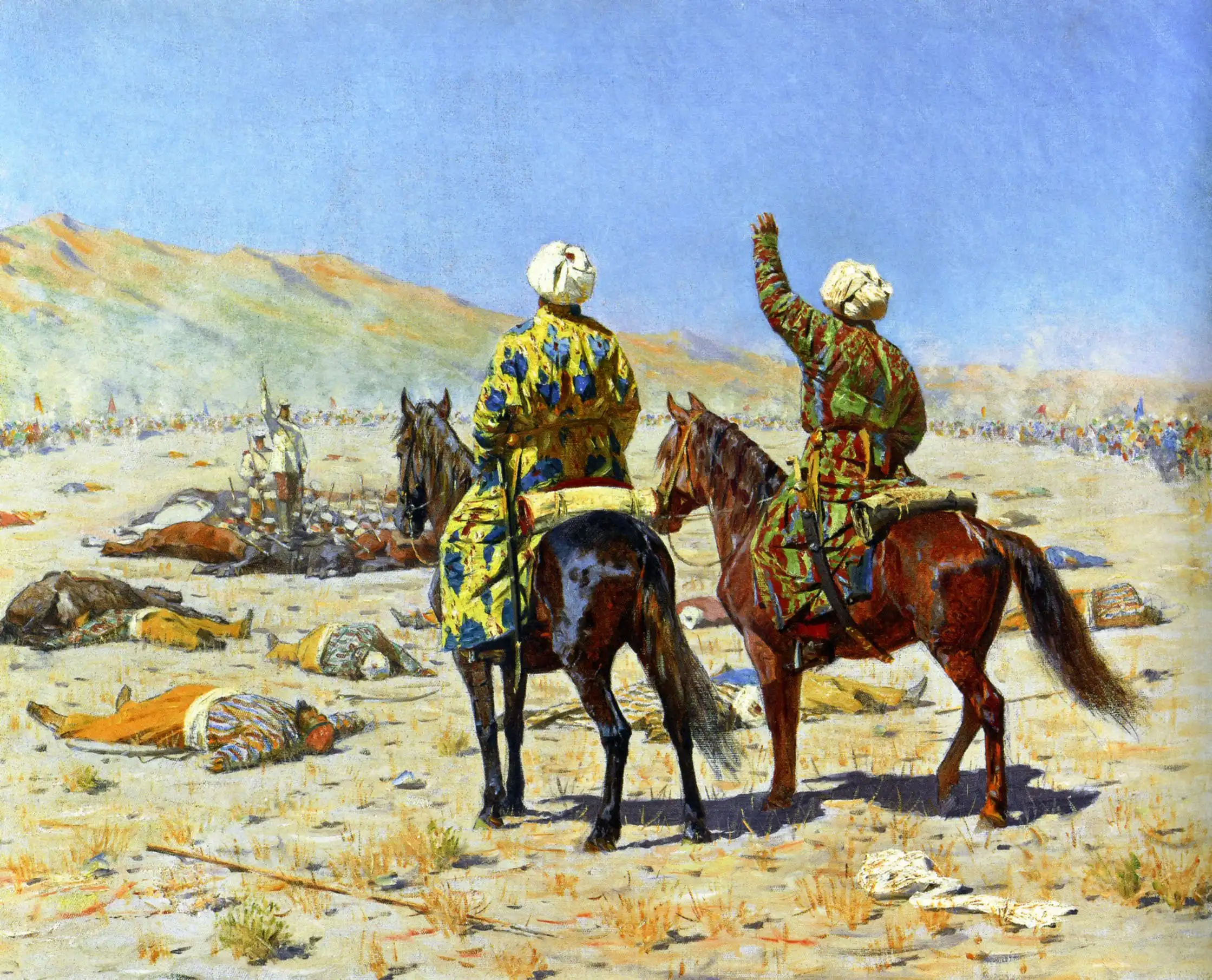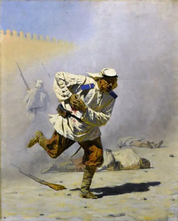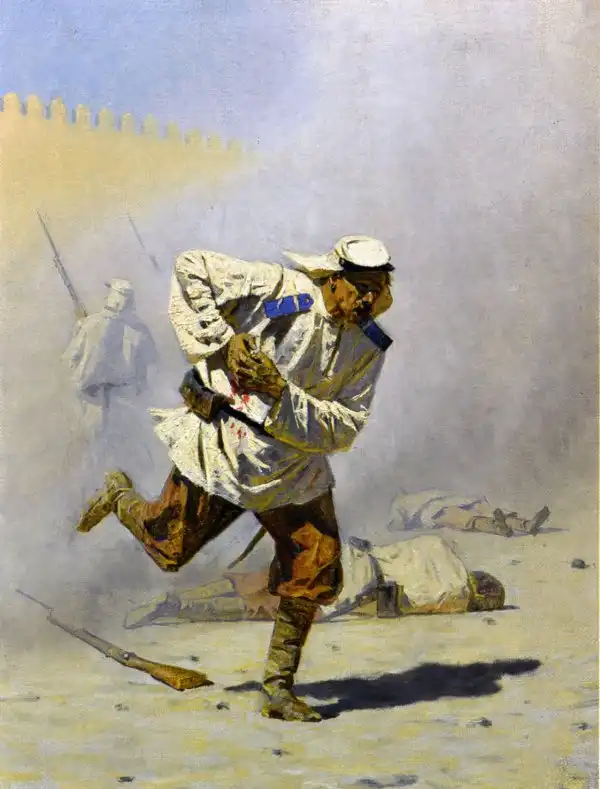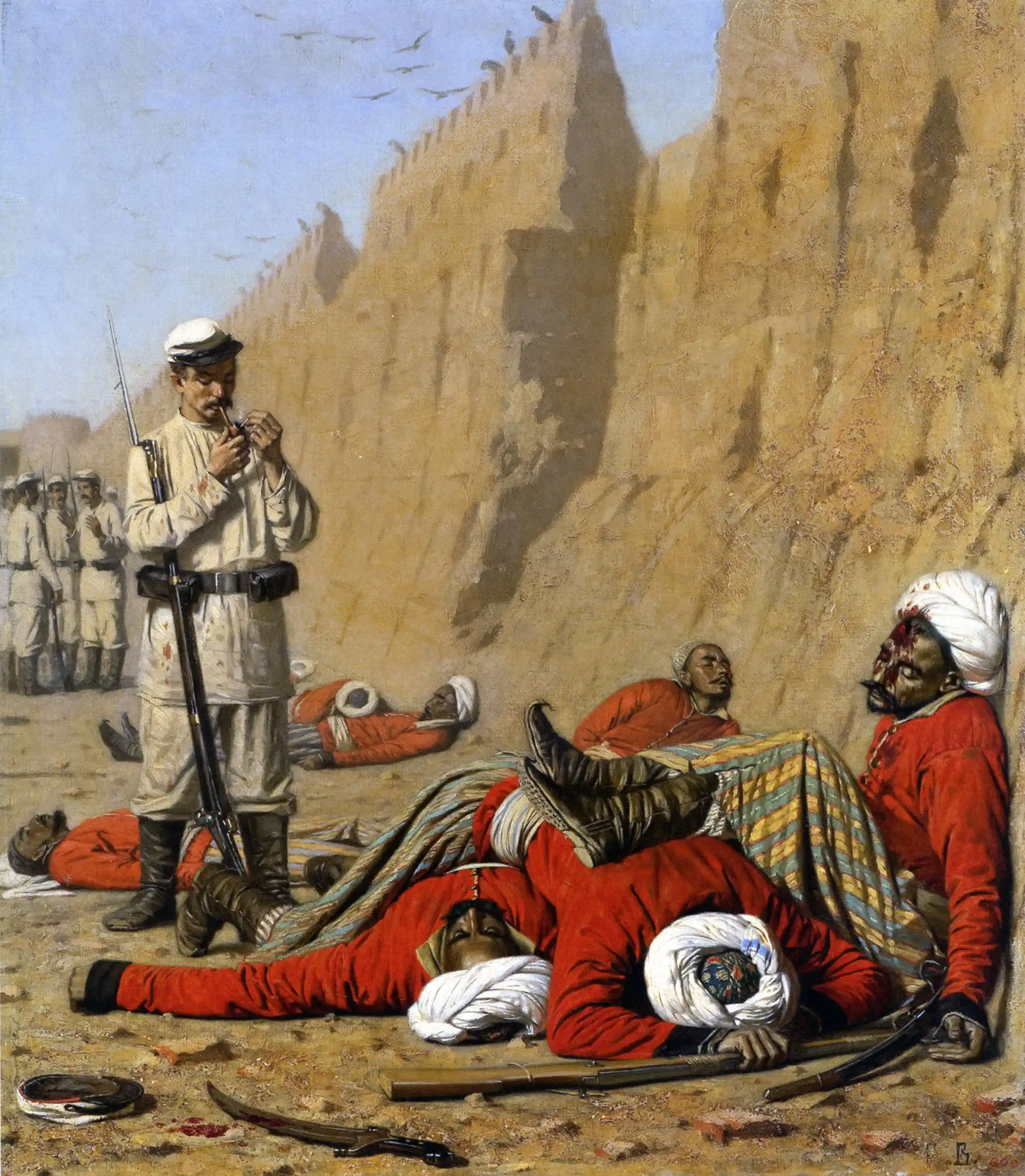22 августа 1867 года Верещагин был зачислен прапорщиком на службу в распоряжение туркестанского генерал-губернатора К.П. фон Кауфмана и командирован в присоединённые к России области Средней Азии. Художник совершил два путешествия в Туркестан – в 1867-1868 и 1869-1870 годах. Здесь он создал множество рисунков и живописных этюдов с натуры, вёл подробный путевой дневник, собирал этнографические и зоологические коллекции, проводил небольшие археологические раскопки. Но главное – именно в Туркестане он узнал, что такое подлинная война, которую страстно желал увидеть вблизи. За проявленное в бою мужество, “в воздаяние за отличие, оказанное во время обороны цитадели г. Самарканда, с 2 по 8 июня 1868 года”, Верещагина наградили орденом Святого Георгия 4-й степени. Это была единственная награда, принятая художником за всю жизнь.