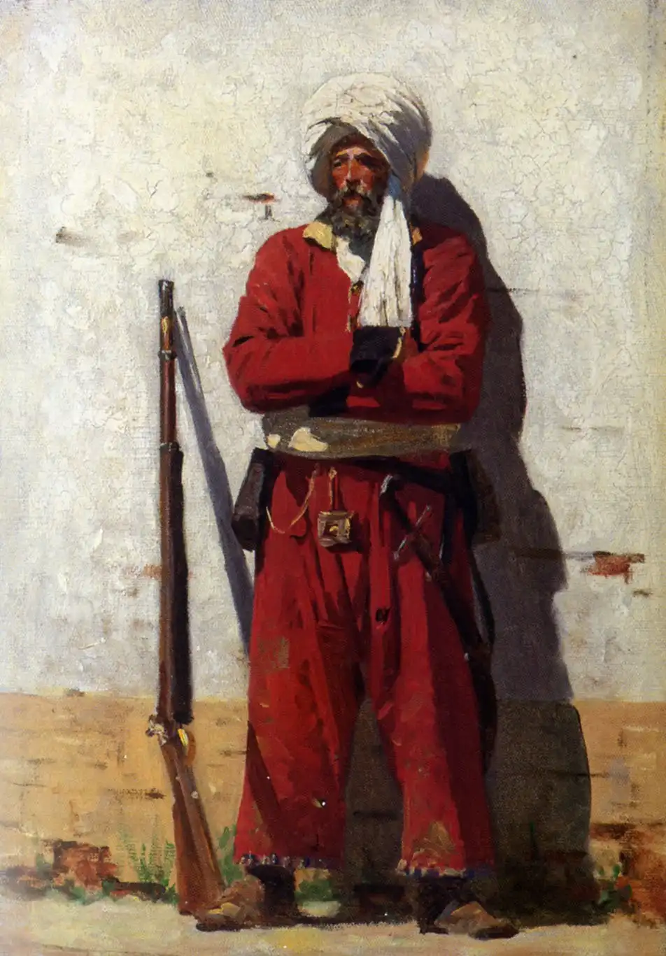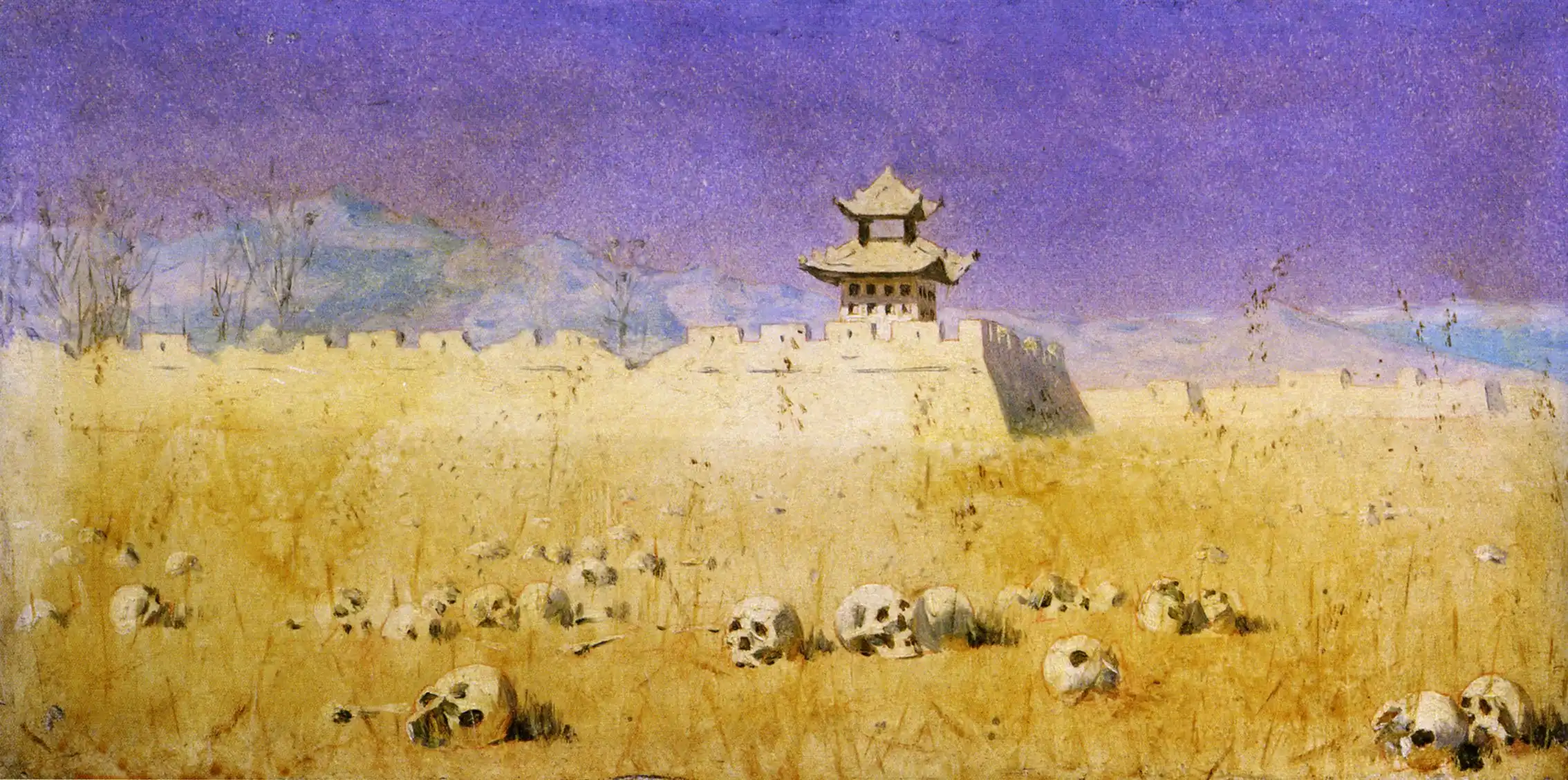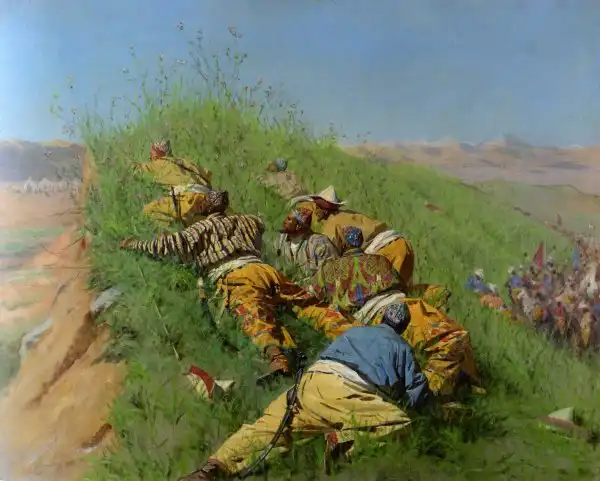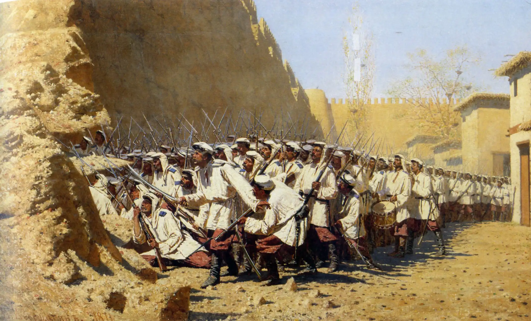 22 августа 1867 года Верещагин был зачислен прапорщиком на службу в распоряжение туркестанского генерал-губернатора К.П. фон Кауфмана и командирован в присоединённые к России области Средней Азии. Художник совершил два путешествия в Туркестан – в 1867-1868 и 1869-1870 годах. Здесь он создал множество рисунков и живописных этюдов с натуры, вёл подробный путевой дневник, собирал этнографические и зоологические коллекции, проводил небольшие археологические раскопки. Но главное – именно в Туркестане он узнал, что такое подлинная война, которую страстно желал увидеть вблизи. За проявленное в бою мужество, “в воздаяние за отличие, оказанное во время обороны цитадели г. Самарканда, с 2 по 8 июня 1868 года”, Верещагина наградили орденом Святого Георгия 4-й степени. Это была единственная награда, принятая художником за всю жизнь.