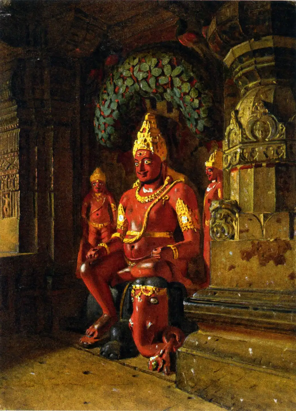 Храмовые росписи и скульптура поразили Верещагина своеобразием форм. Три божества восседают в медитативных позах на тронах в форме раскрытого цветка лотоса. Это растение напоминает о том, что души просветлённых выходят из суеты и грязи бренного мира такими же чистыми и прекрасными, как лотос, вырастающий незапятнанным из болотной тины.