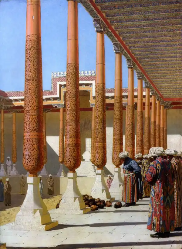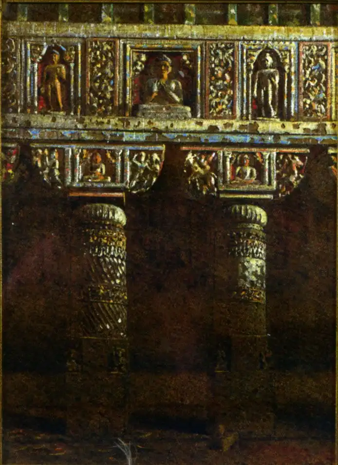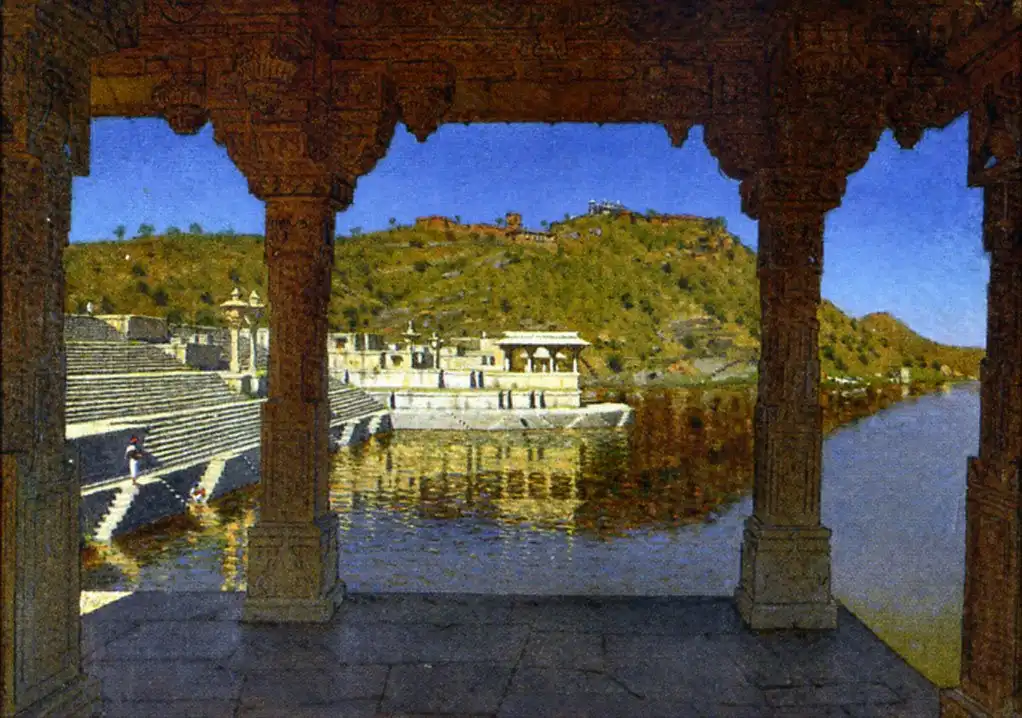 В апреле 1875 Верещагин добрался до столицы горного Кашмира – Сринагар. Город, расположенный на разных берегах извилистой реки Джелам, соединённый мостами и каналами, напоминал европейцам Венецию. В долине реки находится множество озёр. Путешествуя по ним на лодке, художник видел фрагменты дворца могольского императора Акбара I Великого, украшенного внутри цветными изразцами. На другом озере поблизости стояла “небольшая индусская часовня, буддистская или Джаинская, превосходной работы. Детали этой маленькой постройки прелестны. Она опустилась глубоко в воду озера, очевидно, вместе с берегом”. По восоминаниям Е.К. Верещагиной, художник исполнил несколько этюдов в этих местах, на одном из которых запечатлел поразившую его колоннаду внутри джайнского храма. “Джаинский храм на горе Абу (Раджпутана) – один из лучших образцов архитектуры индусов”, так описывал его Верещагин. Джайнизм – религия, представленная на территории Индии и ныне. Джайны строили свои храмовые комплексы в труднодоступных и удалённых местах. Один из них сохранился на горе Абу. Джайнские храмы здесь полностью выполнены из белого мрамора. Возможно, Верещагин изобразил самый известный из них – храм Таджпала, возведённый около XIII века. Этот храм знаменит тонкой резьбой, сплошь покрывающий купол и колоннаду изображениями индийских божеств. Тщательно отполированный белый мрамор и тончайшая резьба завораживают: мерцающий камень создаёт ощущение снежных узоров на стекле. Скорее всего, цвет колонн на этюде Верещагина обусловлен закатным солнцем, окрасившим белый мрамор. Глубина пространства и его трёхмерность мастерски передана художником, изобразившим уходящую в перспективу колоннаду, раскрывающуюся во внутренний дворик с видом на гору Абу.