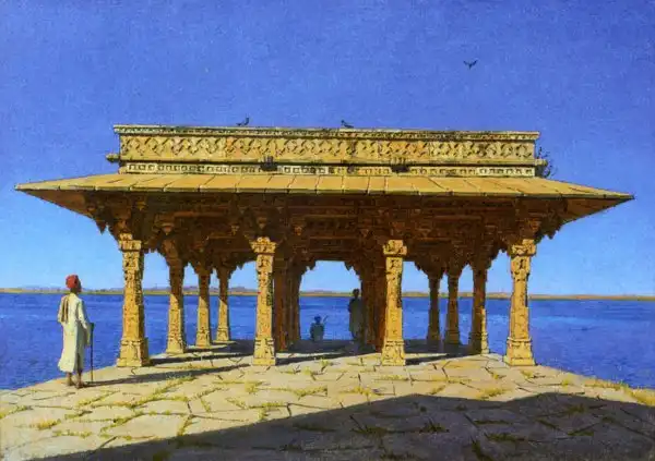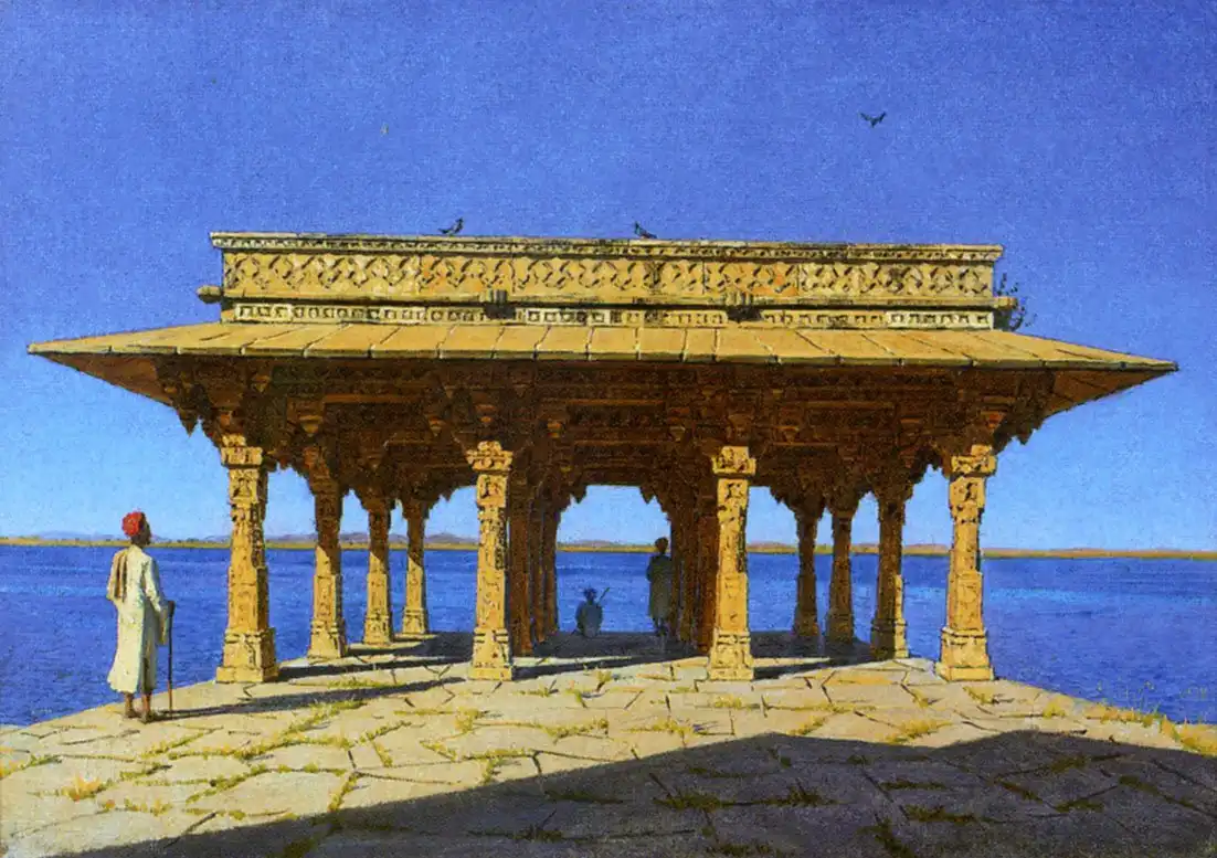 Одно из наиболее изысканно украшенных зданий в Фатехпур-Сикри – это Худжра-и-Ануп-Талао (“Комната у пруда Ануп-Талао”), небольшой павильон, окружённый верандой с колоннами, вид которого, несомненно, поразил русского художника.