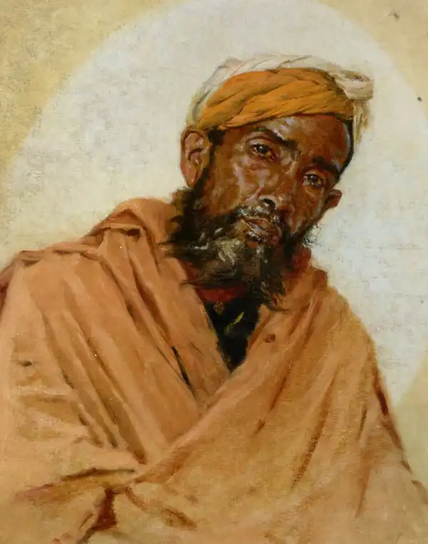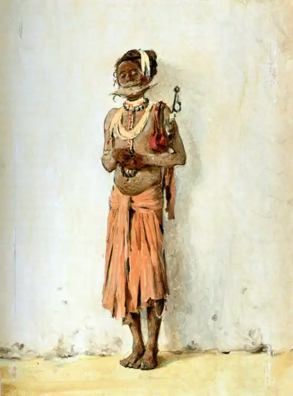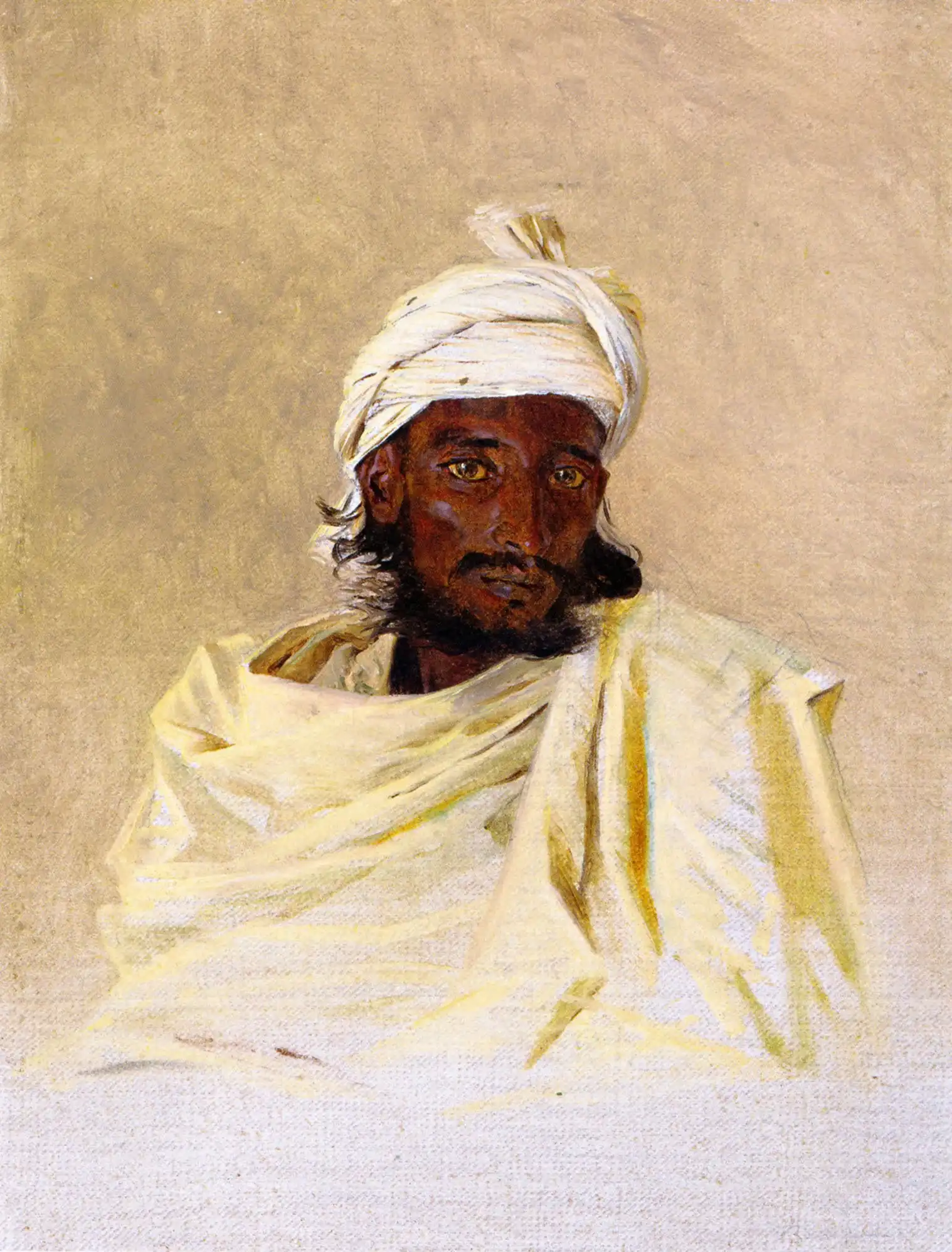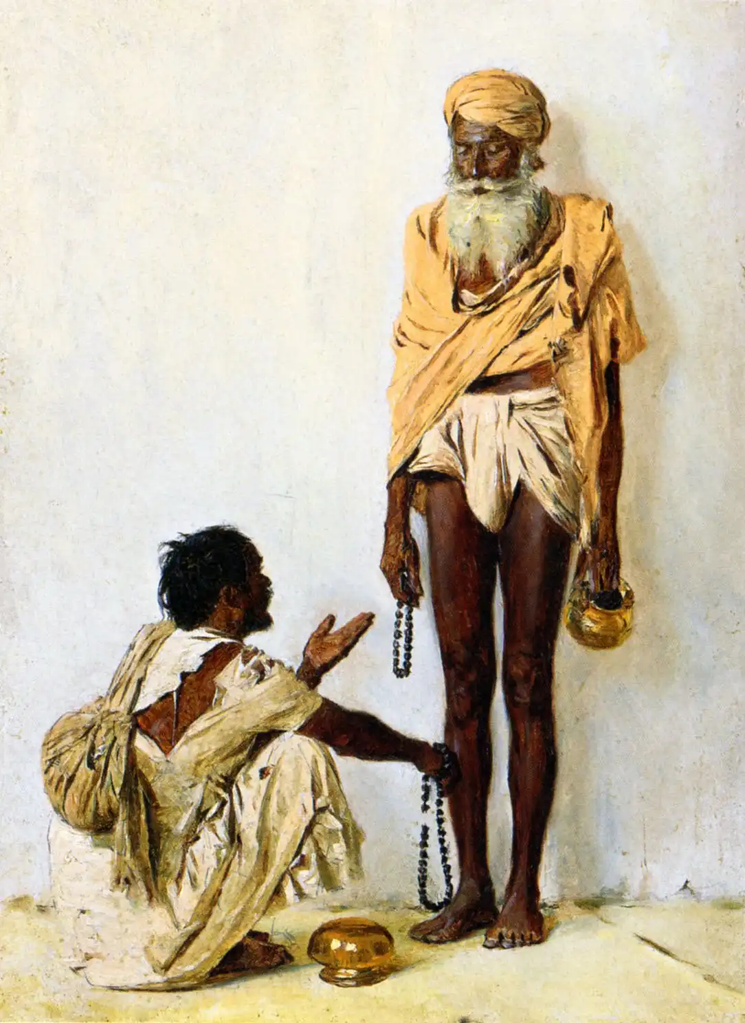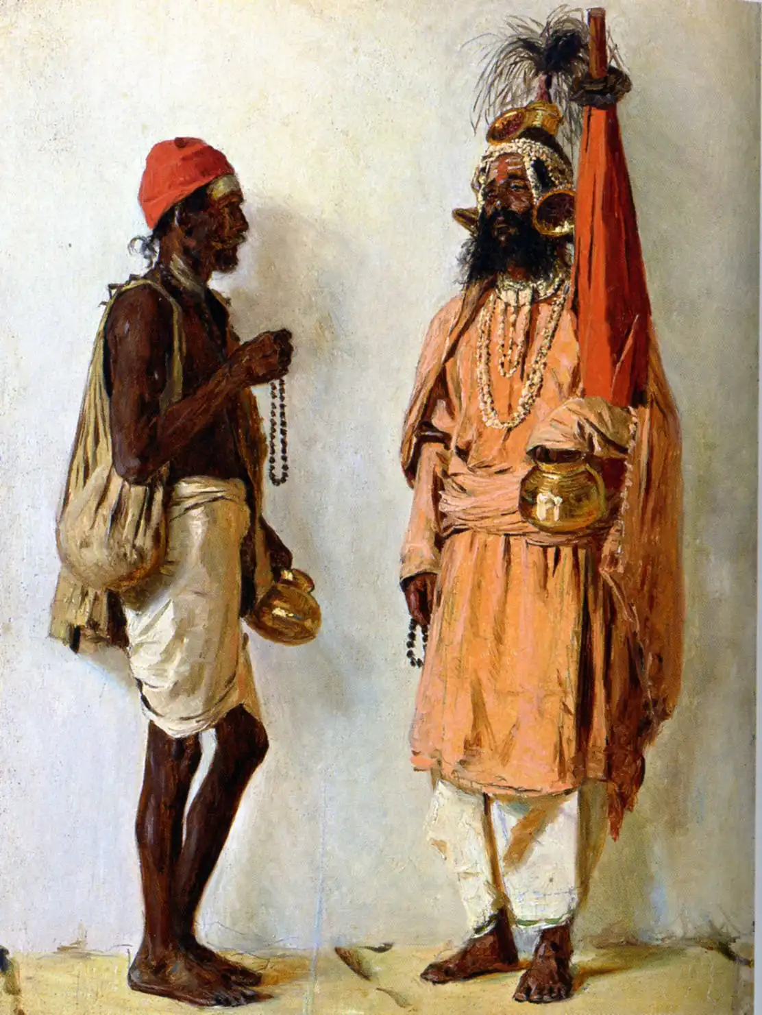 Словом “факир” часто называли нищих индийских странников независимо от того, какую религию они исповедовали, хотя чаще это определение применяли к мусульманам. Аскетов-индуистов, поклонявшихся в основном Шиве или Вишну, обычно называли садху (санскр. “добрый человек”). Этих странных полураздетых или даже обнажённых людей, живших подаянием, Верещагин встречал в Индии повсюду. Некоторые были подобны монахам-учителям, окружённым учениками, они искали собеседников и толковали своё учение; другие проводили дни и ночи в медитации; многие садху истязали себя: сидели у костра под жарким солнцем, лежали на гвоздях, часами висели на дереве вниз головой или держали руки над головой, пока те не омертвеют. Встречались аскеты, похожие на сумасшедших, были среди них и плуты, позирующие за милостыню перед зрителями.