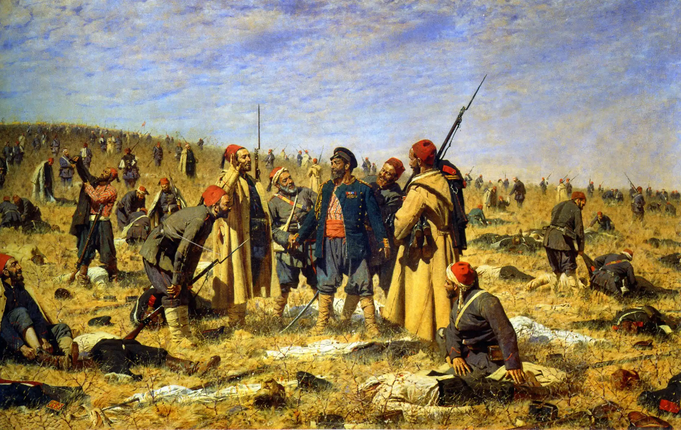 В связи с вспыхнувшей на Балканах войной за освобождение Болгарии от турецкого владычества Верещагин, прервав работу над Индийской серией, в апреле 1877 года выехал в Кишинёв, в Главный штаб русской армии. Причисленный к отряду генерала М.Д. Скобелева, он спешил на передовую линию фронта, готовый сразу идти в атаку и первым встретиться с башибузуками. Во фронтовых письмах художник сообщал, что “приготовился к смерти ещё в Париже” и пошёл воевать по зову сердца, чтобы заглянуть в глаза войне и увидеть её истинное лицо.