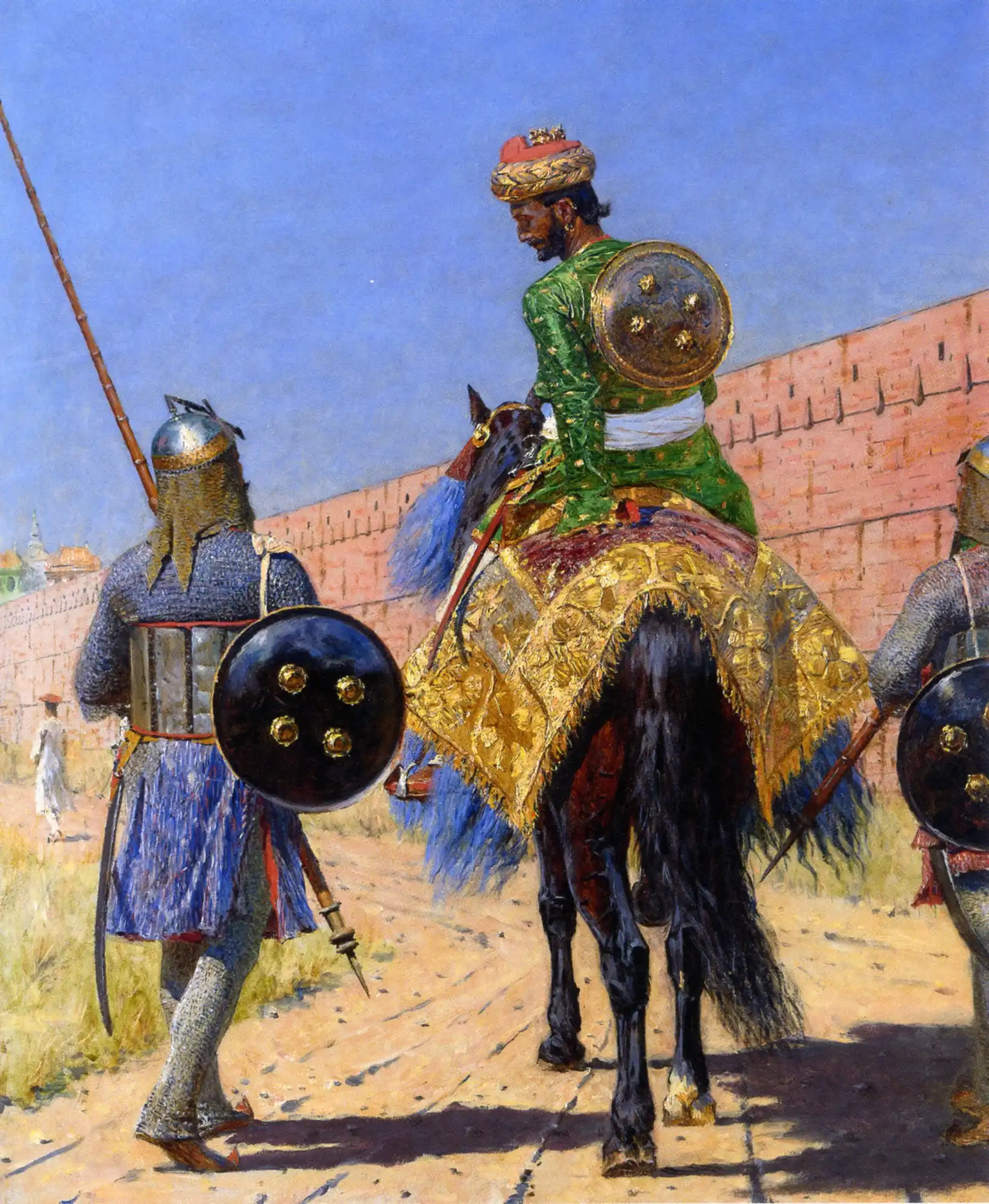 Величественное сооружение, изображённое на этюде, - зал для частных аудиенций Диван-и-Кхас, построенный в 1636-1637 Шах-Джаханом. В нём принимали посетителей и последующие могольские правители. Здесь восседал на троне сын Шах-Джахана Аурангзеб, державший отца в заточении в делийском Красном форте, казнивший двух своих братьев; сюда слуги принесли их головы. Вероятно, под впечатлением от этой истории русский художник решил включить в название картины имена созидателя – отца и узурпатора – сына.