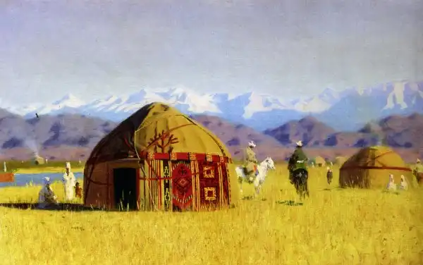 В Джалангаче художник, недовольный местными лошадьми, велел запрячь верблюдов в свой тарантас. Однако “проклятые животные сломали мой экипаж, увлекая его на скат одного холма, и мне поневоле пришлось глотать пыль”. (Верещагин В.В. От Оренбурга до Ташкента)