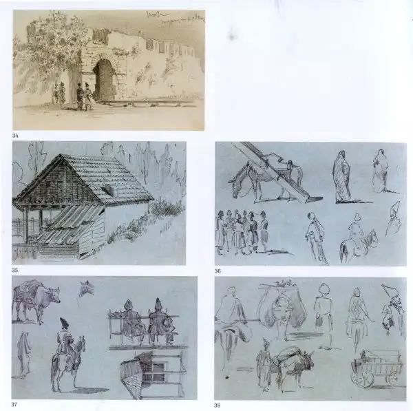 37. Всадник-абхазец. Навес под окном. Двое абхазцев, сидящих на скамье. Вол с поклажей. Сидящая женщина в покрывале. Голова ослика