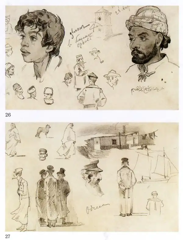 26. Юноша-цыган. Турок в чалме. Две мужские фигуры. Мужские головы в различных головных уборах. Башня