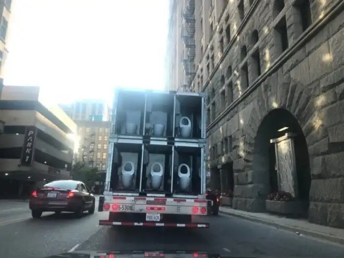 Машина, перевозящая портативные туалеты в центре Чикаго