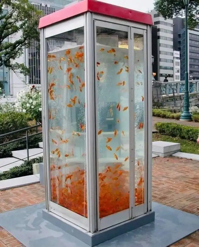 Старые телефонные будки превратились в гигантские аквариумы с золотыми рыбками, на улицах Осаки