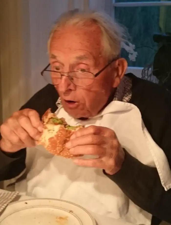Дедушке 94 года, и сегодня он впервые попробовал гамбургер