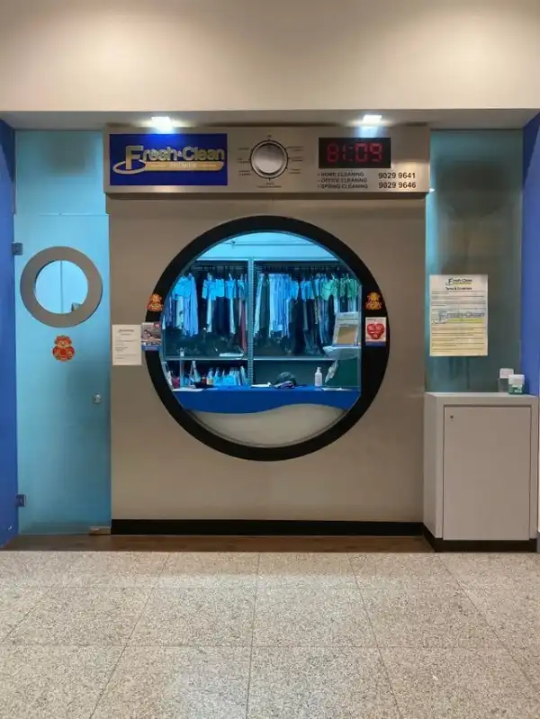 Стойка химчистки в Сингапуре, похожая на гигантскую стиральную машинку