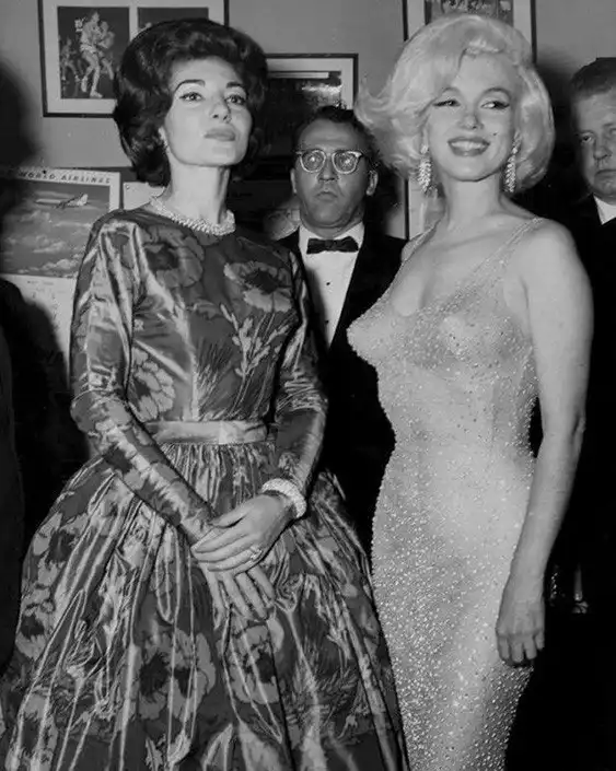 Мария Каллас и Мэрилин Монро в своём теперь уже культовом платье на гала-концерте в честь дня рождения Джона Кеннеди, 1962 год