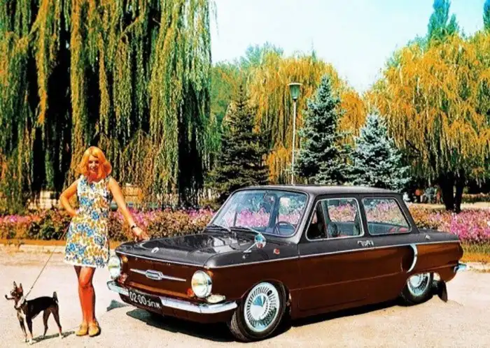 Советская автомобильная реклама Реклама ЗАЗ 968АЕ «Запорожец», необычный семейный стильный по тем временам автомобиль.