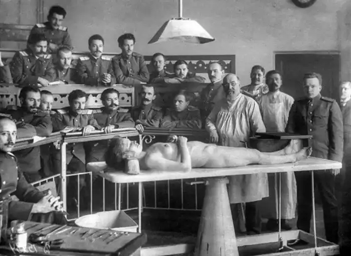 Группа слушателей Императорской Военно-медицинской академии на занятиях по анатомии, 1900-е годы