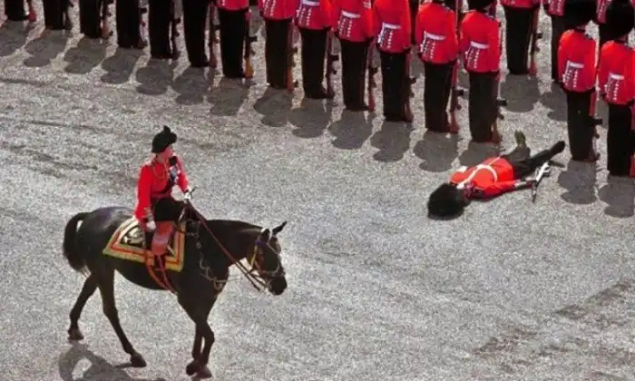 Гвардеец упал в обморок как раз в момент, когда королева Елизавета II проезжала на лошади во время парада в Лондоне. 1970 год