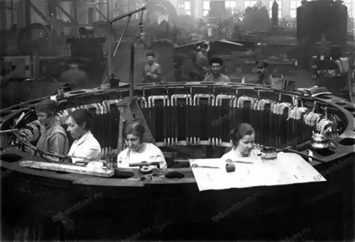Сборка электродвигателя в одном из цехов завода «Электросила». Автор съемки С.А. Магазинер 1926 год