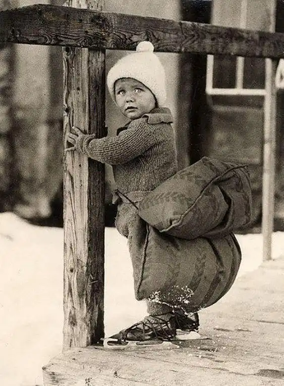 Мальчик с подушкой, привязанной сзади, чтобы смягчить падение на льду, катается на коньках, Нидерланды, 1933 год.