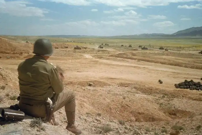 Генерал Джордж С. Паттон наблюдает, как его войска продвигаются через долину Эль-Геттар, Тунис, март 1943 года