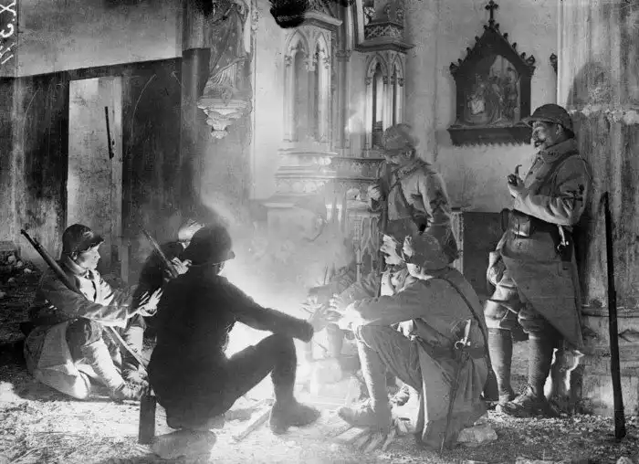 Французские солдаты разговаривают у костра внутри поврежденной церкви недалеко от Сен-Миеля, Франция, 1916 год