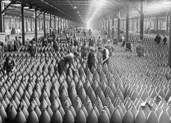 Ряды артиллерийских снарядов на Национальной артиллерийской фабрике в Чилуэлле во время Первой мировой войны, 1917 г.
