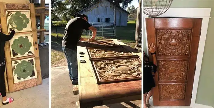 "Однажды мой парень позвонил мне и сказал, что «купил для меня кое-что», что мне понравится. Он нашел это что-то выброшенным на одной из проселочных дорог недалеко от нашего 110-летнего загородного дома, который мы только что купили и начали ремонтировать. Это была эта самая дверь, и я влюбилась в нее как есть. Он потратил несколько часов на то, чтобы удалить с нее старую краску, а потом повесил ее на входе в мою гардеробную"