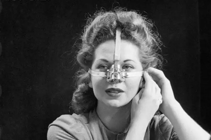 На фото специалист проводит замеры с помощью микрометра красоты. Этот инструмент позволял рассчитать точные пропорции лица, для последующей коррекции с помощью косметики