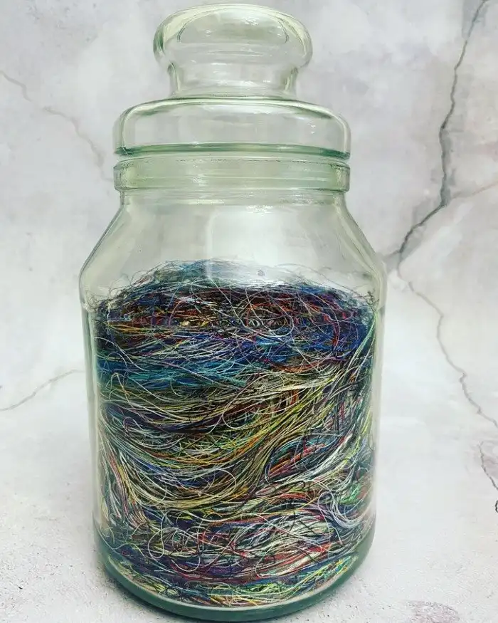 15. "Я собираю обрезки ниток для вышивания и складываю их в эту банку уже около 5 лет"