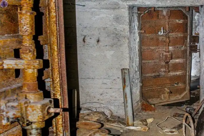 После спуска на входе в тамбур-шлюз нас встречает ржавая давно неработоспособная защитно-герметическая дверь.
